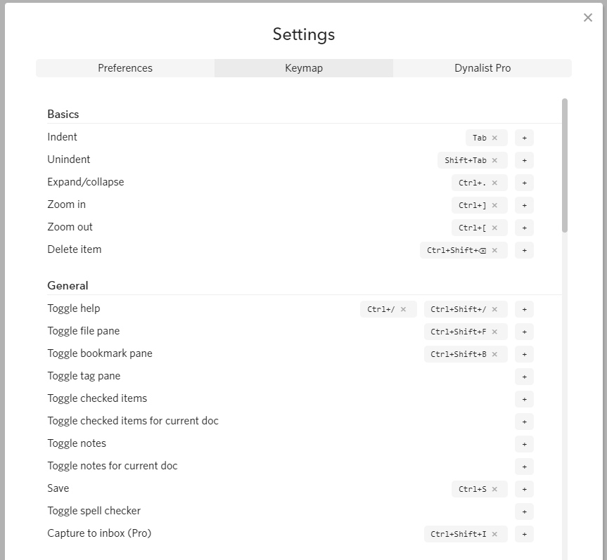 특히 dynalist 의 경우 단축키가 잘되어 있습니다. Settings > keymap 에서 확인하실 수 있습니다.