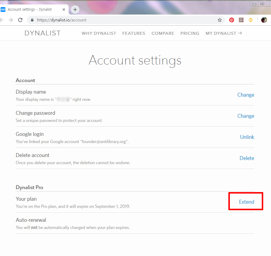 회원가입 후 유료 버전 결제를 해봅니다. Dynalist Pro > Your Plan > Extend 를 누릅니다.