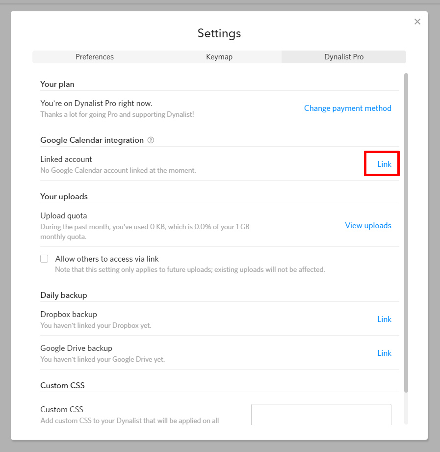 구글 캘린더와 연동이 가능합니다. Google Calendar Integratoin > Linked account > Link 를 통해서 연동시킬 구글계정을 선택합니다.