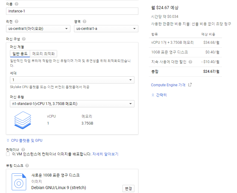 결제 정보 등을 입력하고 클라우드 가입을 마치고, 프로젝트를 생성한 후, 본격적인 사용을 위한 인스턴스를 생성해야 한다. VM 인스턴스는 다음과 같이 생성할 수 있다.