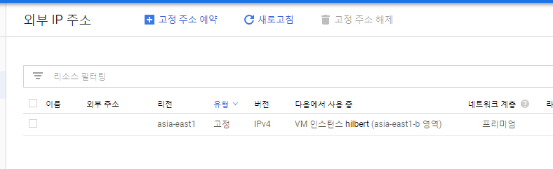 이렇게 VM 인스턴스 생성이 끝나면 세부적인 설정을 해야한다. 우선적으로 SSH, FTP 작업을 위해 IP 주소부터 부여해야한다. 외부 IP 주소는 아래 메뉴에서 설정할 수 있다.