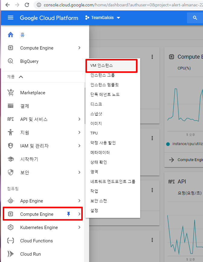 클라우드 홈 좌측 탐색메뉴에서 Computer Engine > VM 인스턴스 를 선택한다.