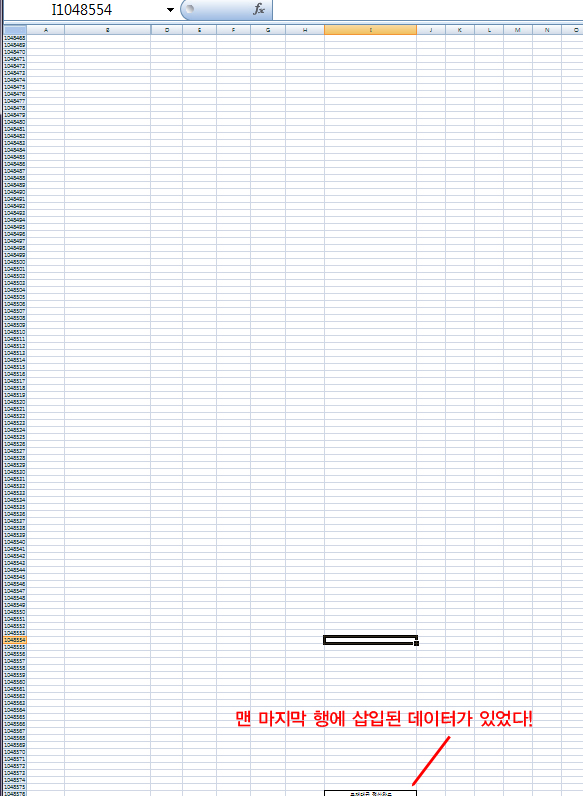 이 경우 해당 워크시트 보이지 않는 곳에 데이터나 서식이 입력된 셀이 있는지 확인해봐야 한다. 아래의 경우 맨 마지막 행에 문자가 입력된 셀이 있었던 것이다.
