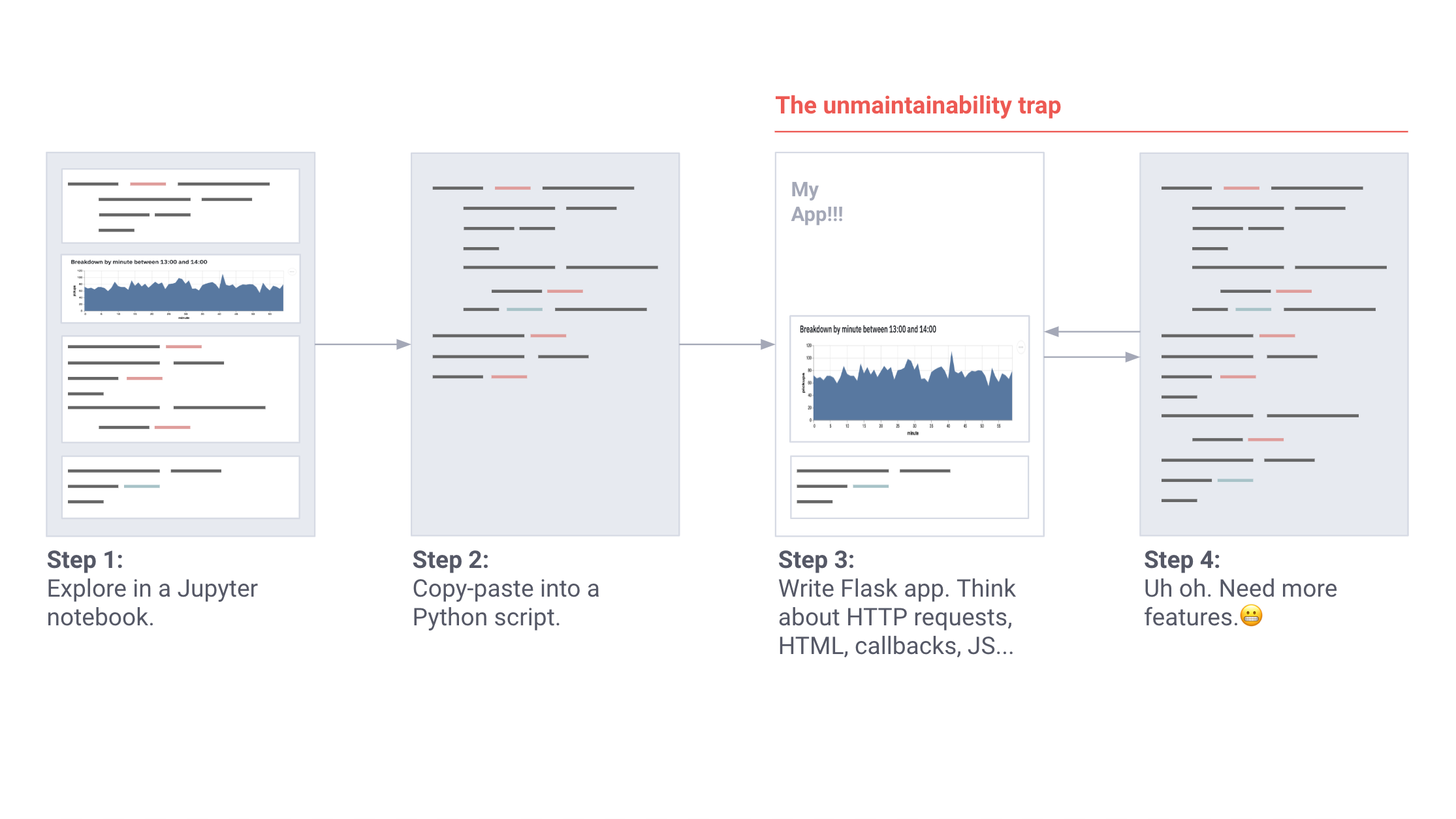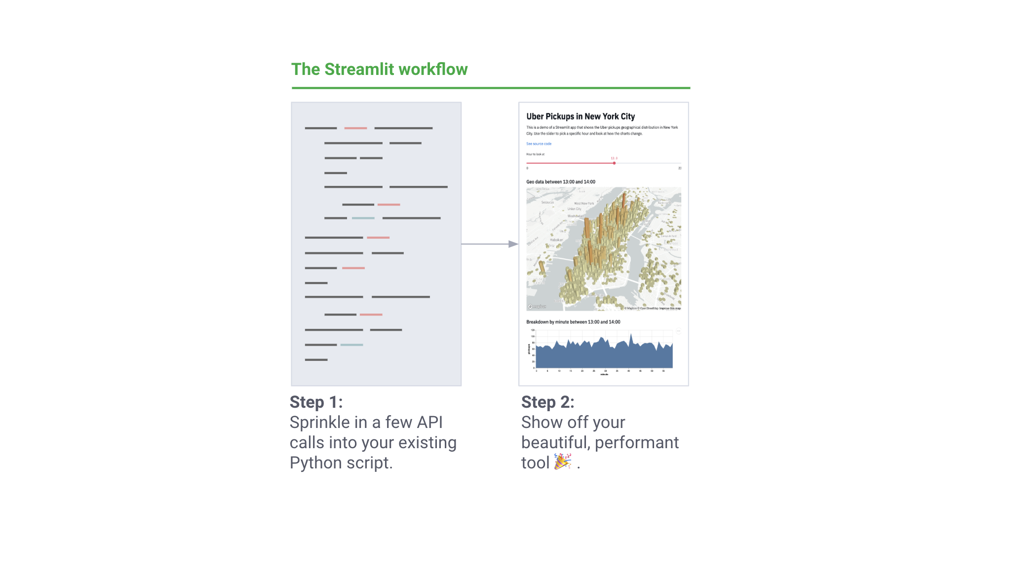 위의 방법도 물론 훌륭하다. 하지만 새로운 기능이 필요하다면, 그리고 툴 팀이 10개 이상의 서로 다른 프로젝트를 서포팅하고 있어 업데이트에 약 2달 정도 소요될 것입니다라고 말하는 바람에, 다시 주피터 노트북을 통해 실행한 다음, 이 내용을 파이썬 스크립트로 옮긴다. HTTP request, HTML, callback 등의 요소를 고려해가면서 Flask 앱 등을 작성한다. 구동해보고 부족한 기능이 있으면 다시 위의 과정을 반복한다고 생각해보자. 이러한 부분에서 어떻게 파이썬 스크립트를 작성하는 것처럼 손쉽게 ML 툴을 만들 수 없을까하는 의문에서 Streamlit 이 탄생했다. Streamlit 의 목표는 ML 엔지니어들이 Tools team의 필요없이 앱을 만들 수 있도록 하는 것이다. Streamlit 의 개발플로우는 다음과 같다.