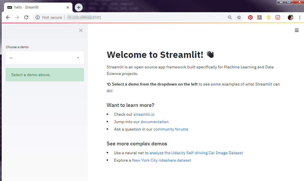 hello world 앱을 실행해보자. 다음과 같이 입력한다. GCP 사용자의 경우 8501 포트 사용이 가능하도록 방화벽 정책부터 추가한다.