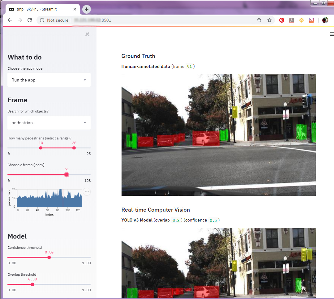 상기 프로젝트는 Udacity self-driving-car 데이터셋과 YOLO object detection 을 하나의 Streamlit 앱으로 통합시켰다. 이 데모는 불과 300라인 미만의 코드로 이루어져있다. 이 Streamlit 데모는 전체 Udacity 자율주행차 사진 데이터셋에 대해 시맨틱 검색을 수행하여, 사람이 주석을 단 실측자료 라벨을 시각화하고, 동시에 실시간으로 complete neural net (YOLO)을 구동하게 한다.