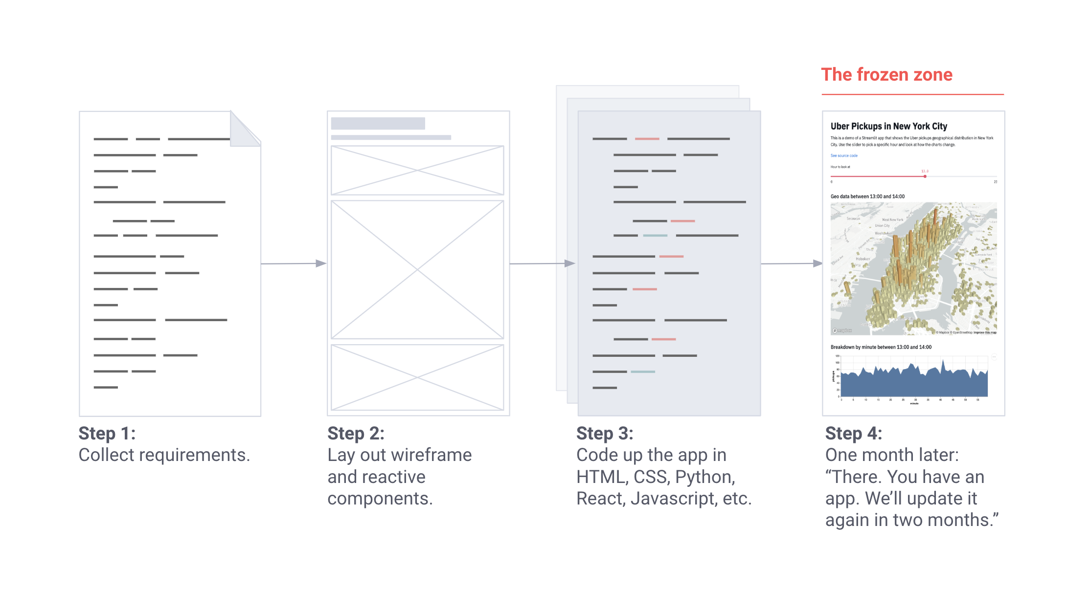 위의 방법도 물론 훌륭하다. 하지만 새로운 기능이 필요하다면, 그리고 툴 팀이 10개 이상의 서로 다른 프로젝트를 서포팅하고 있어 업데이트에 약 2달 정도 소요될 것입니다라고 말하는 바람에, 다시 주피터 노트북을 통해 실행한 다음, 이 내용을 파이썬 스크립트로 옮긴다. HTTP request, HTML, callback 등의 요소를 고려해가면서 Flask 앱 등을 작성한다. 구동해보고 부족한 기능이 있으면 다시 위의 과정을 반복한다고 생각해보자. 이러한 부분에서 어떻게 파이썬 스크립트를 작성하는 것처럼 손쉽게 ML 툴을 만들 수 없을까하는 의문에서 Streamlit 이 탄생했다. Streamlit 의 목표는 ML 엔지니어들이 Tools team의 필요없이 앱을 만들 수 있도록 하는 것이다. Streamlit 의 개발플로우는 다음과 같다.