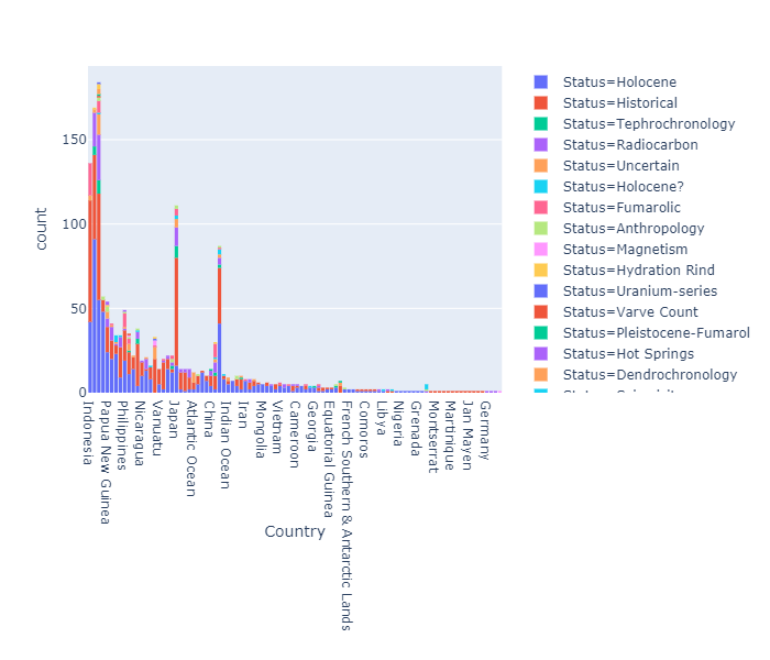 위 그래프에서 볼 수 있듯이 대부분의 화산의 상태는 Holocene 또는 Historical 이다.