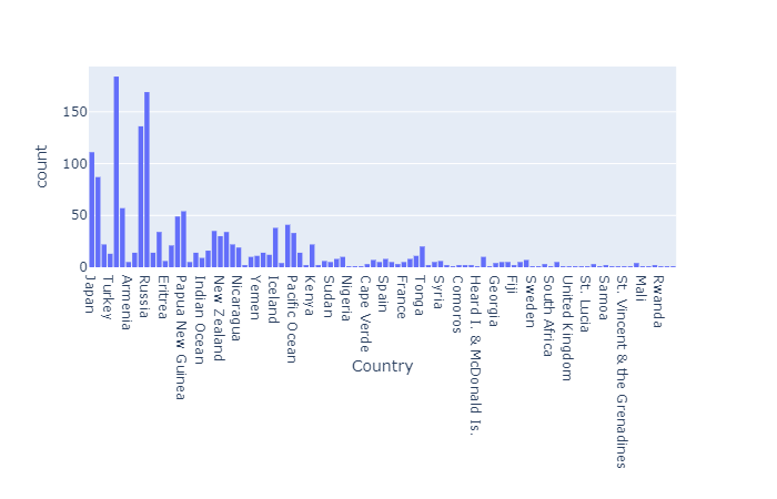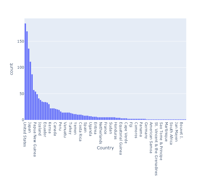 처음으로 눈이 가는 요소는 국가별로 분포된 화산의 수이다.