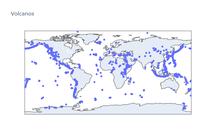 이제 데이터셋의 새로운 섹션에 초점을 맞춰보자. 화산의 지리적위치이다. 위도와 경도라는 2개의 속성을 통해 지도상에 화산의 위치를 표시해준다. 이를 Plotly로 구현해보자.
