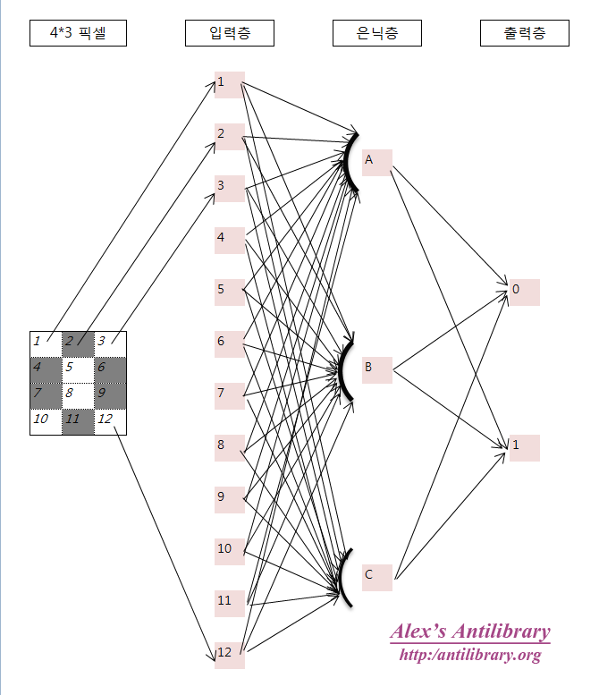 - 숫자0 에는 위의 패턴A 와 패턴C 가 포함되어 있고, 숫자1 에는 패턴B 가 포함되어 있다고 예측한다.