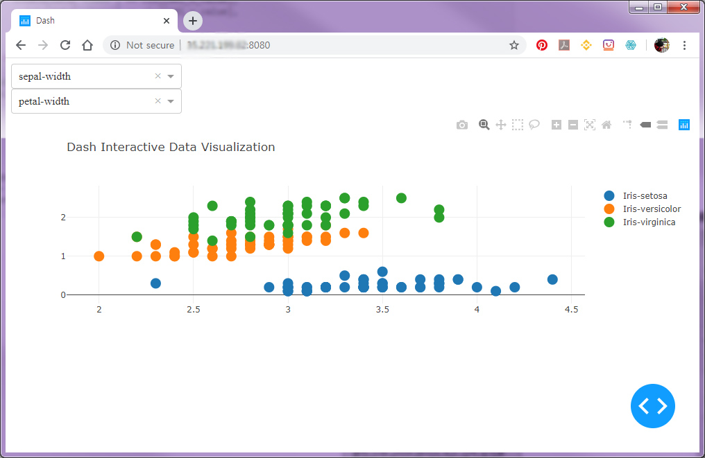- 그리고 update_output 함수에서, 드랍다운 리스트에서 선택한 데이터와 컬럼으로 산점도를 그리도록 했다. 각 클래스별로 산점도를 그리도록 했음에 주목하자. 보다시피 함수의 끝과 ‘data’ 리스트내에 루프문이 있다. list comprehension 이라고 부르기도 하는데, Scatter() 객체를 n 번 반환한다. 여기서 n 은 데이터의 'class' 컬럼의 유일한 레코드의 수이다.