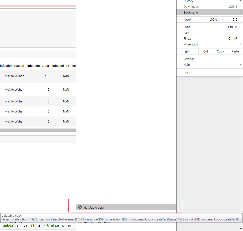 주피터 노트북은 크롬 등의 브라우저에서 구동이 되므로, 셀을 복사하고 클립보드에 붙여넣는 자바스크립트를 만들 수 있다. 다음의 자바스크립트를 크롬 등의 북마크에 저장하고 노트북이 구동되는 페이지에서 실행하면 된다. 아래를 보자.