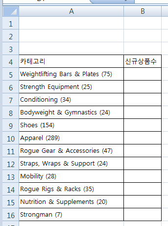 예제에 사용할 데이터는 Roguefitness 카테고리별 새롭게 등록된 상품수 데이터로, 여기에서 숫자만 추출하는 방법을 알아보자. 다음과 같이 카테고리명 다음 ( ) 안에 상품수가 들어가 있다.