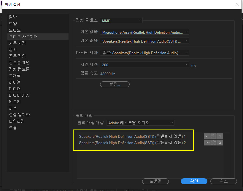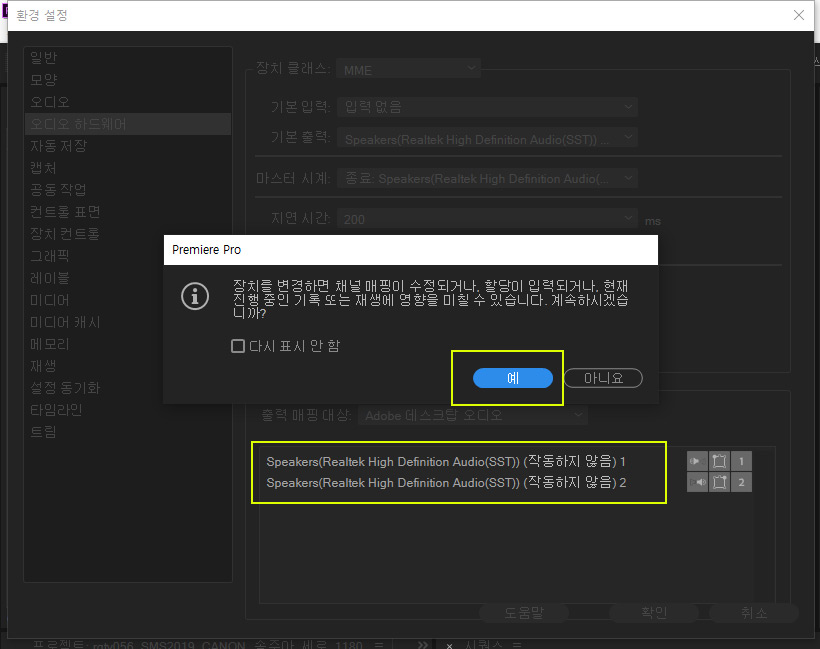 "MME 장치 내부 오류입니다. [오디오 하드웨어] 환경 설정을 여시겠습니까?"