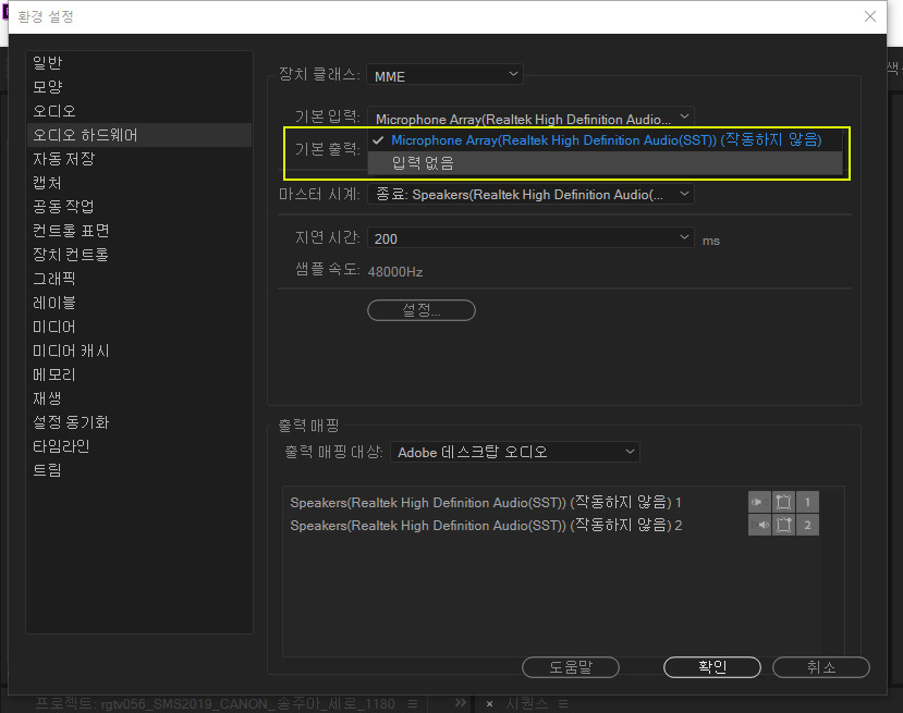 이 경우, 오디오 하드웨어 환경 설정 지정 메뉴로 이동하여 다음과 같이 설정한다. 편집 > 환경 설정 > 오디오 하드웨어 로 이동하여, 연결된 MME 디바이스의 기본출력 장치 설정을 살펴보자. 출력매핑 부분을 보면 (작동하지 않음)으로 나온다.