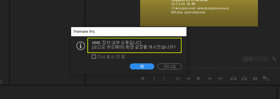 프리미어 프로 프로젝트 오픈시 다음과 같은 메시지가 뜨면서 소리가 나지 않는 경우