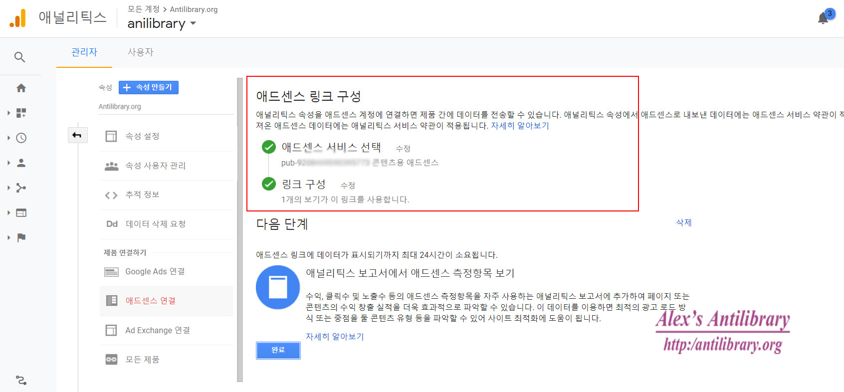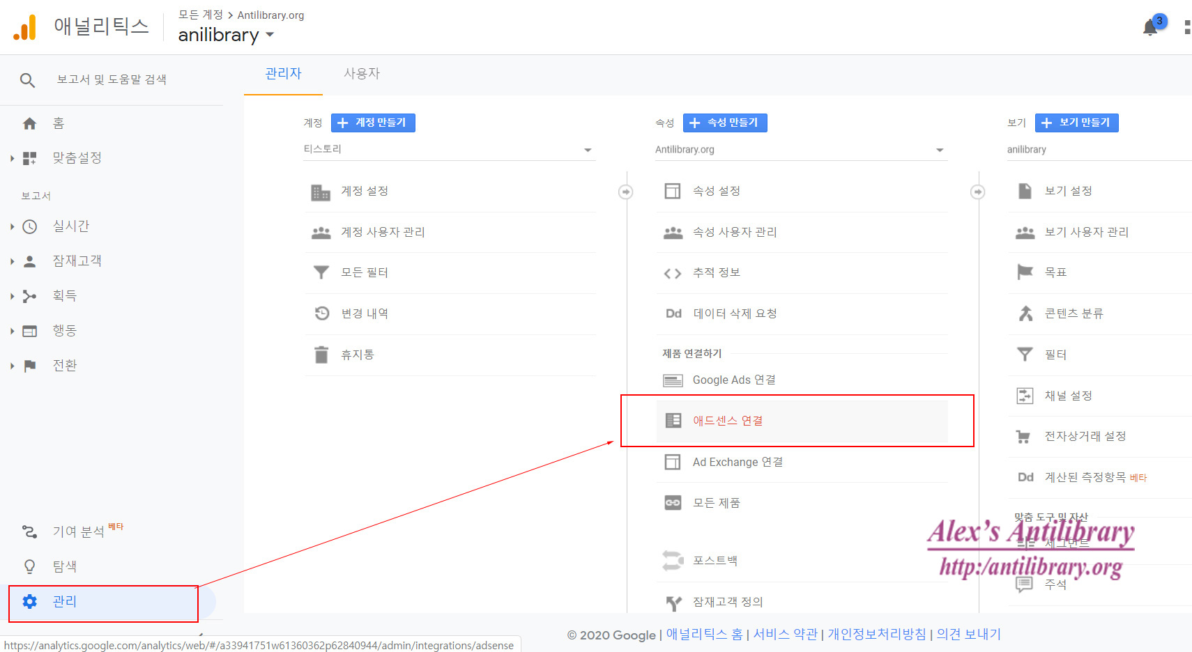 먼저 애드센스 연결을 진행한다. 다음과 같이 애널리틱스 페이지에서 관리 > 속성 > 애드센스연결을 클릭한다.