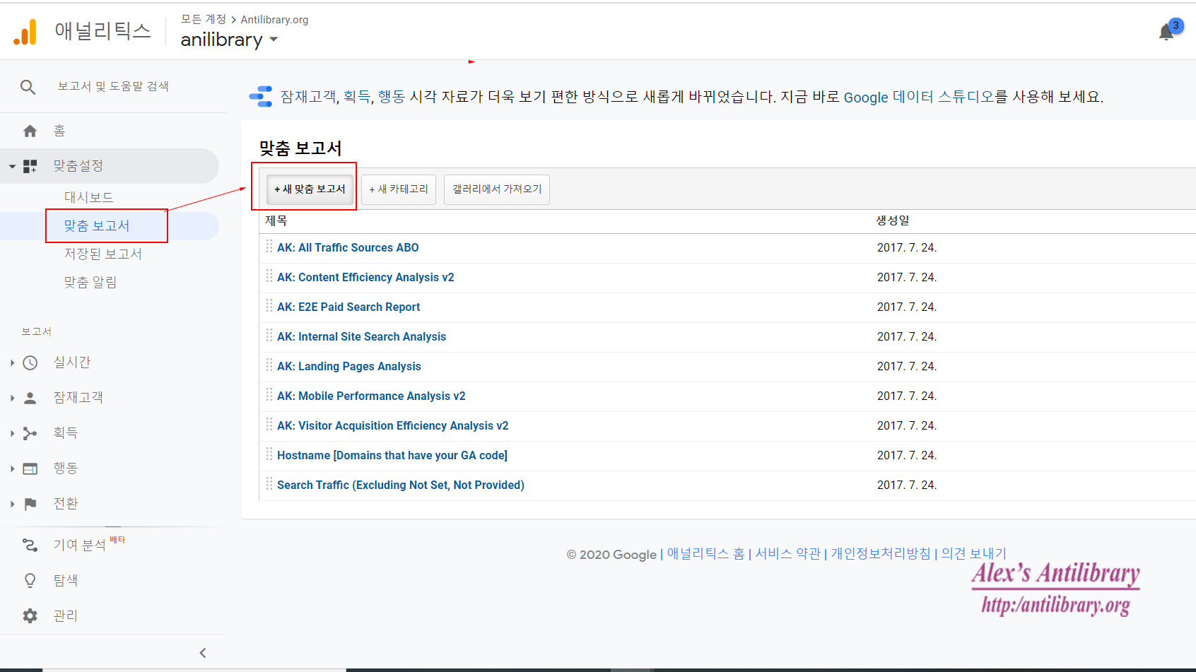 애널리틱스와 애드센스 연결이 끝나면 맞춤설정 > 맞춤보고서 > 새맞춤보고서 메뉴를 통해 새로운 맞춤보고서를 생성한다.
