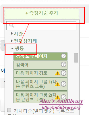 다음으로 측정기준을 추가한다. 아래와 같이 행동 > 검색 도착 페이지 를 선택한다.