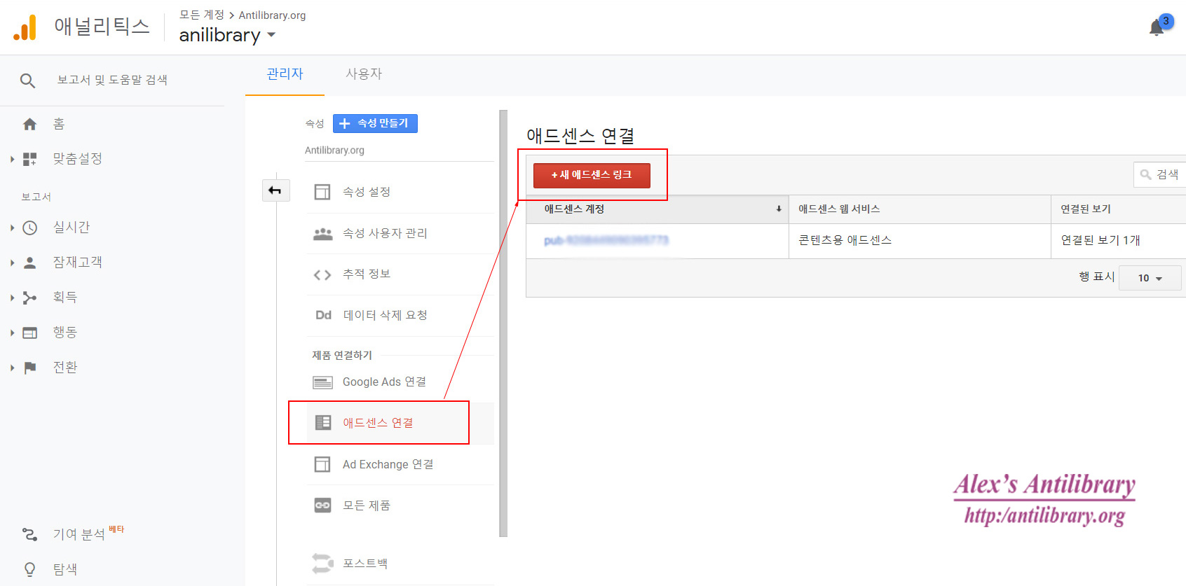 새 애드센스 연결을 눌러 애드센스 링크를 구성한다. 게시자 ID 는 위에서 보는 바와 같이 구글 애드센스 홈페이지 계정 > 계정정보에서 확인할 수 있다.