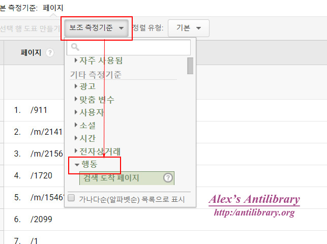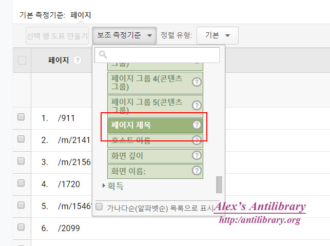 아래 분석 페이지 하단에서 보조 측정기준 > 행동 > 페이지제목 을 선택한다.
