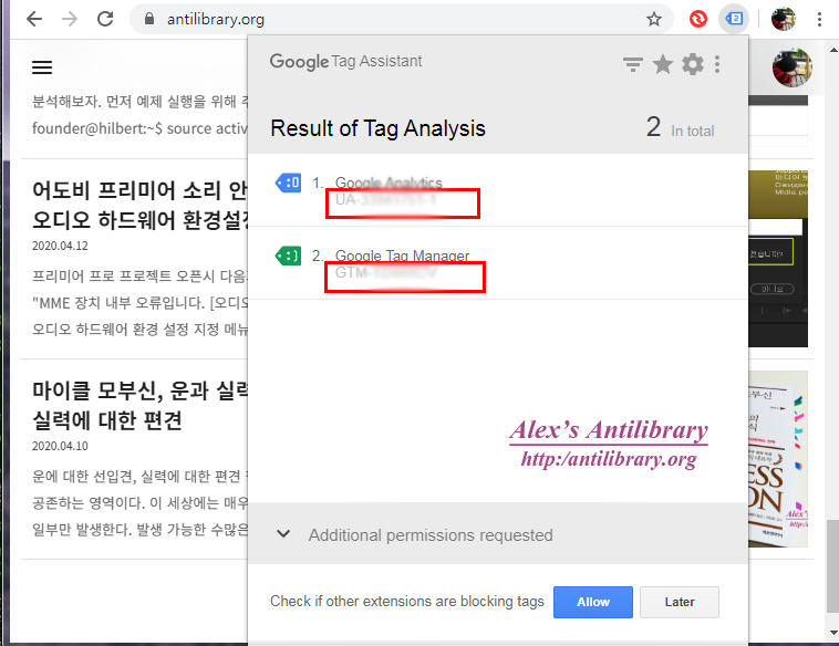 마지막으로 크롬 확장프로그램의 하나인 Tag Assistant 를 사용할 수 있다. 해당 확장프로그램을 설치한 후, 녹색으로 상태 표시가 되면 정상적으로 설치가 된 것이다.