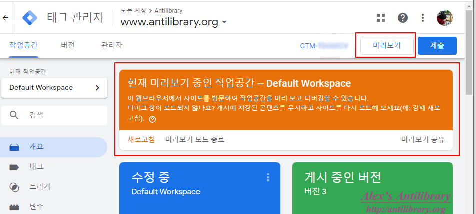 미리보기와 디버그 모드를 활성화하면 다음과 같이 미리보기 중임을 알리는 배너가 뜨게 된다. 그리고 구글 태그 매니저 컨테이너 코드가 구현된 해당 웹사이트를 새로고침하면 디버그 패널을 확인할 수 있다.