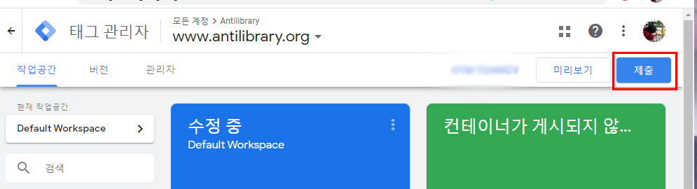 코드 붙여넣기가 끝나면, 다시 Google 태그 관리자 계정으로 돌아와 컨테이너 제출을 진행해야한다. 제출되지 않은 GTM 컨테이너는 에러를 발생 (브라우저 콘솔에서 확인할 수 있다) 시키기 때문이다.