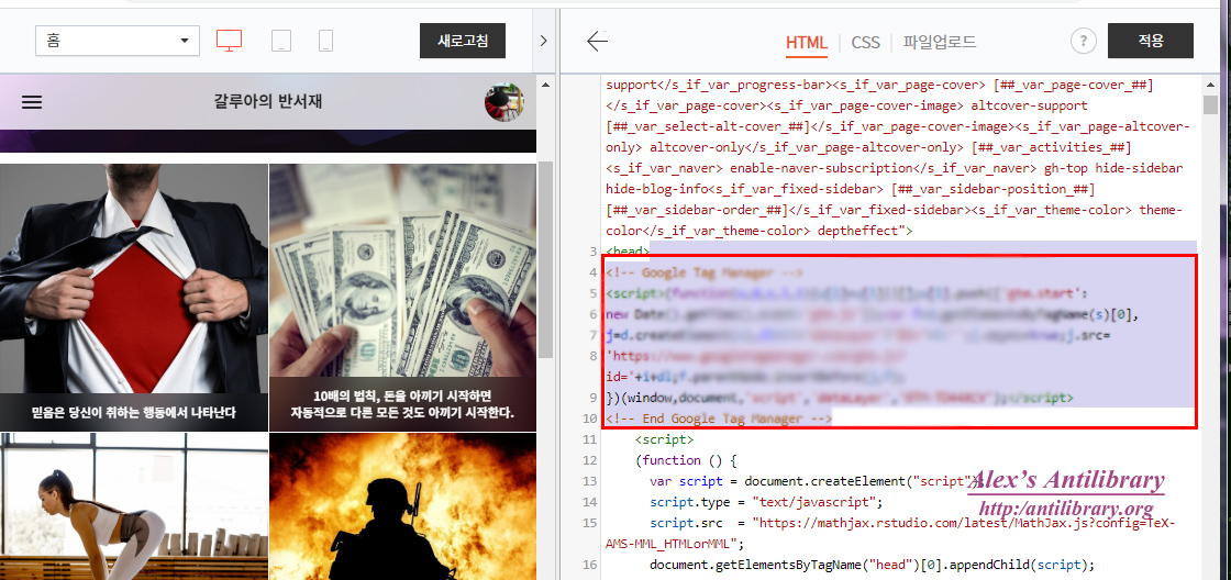 아래는 티스토리의 예로, 위의 구글 태그 관리자 설치 팝업에 나와있는 대로 다음과 같이 스크립트를 붙여넣는다. 먼저 상단 코드는 <head>에서 가능한 한 높은 위치에 코드를 붙인다.