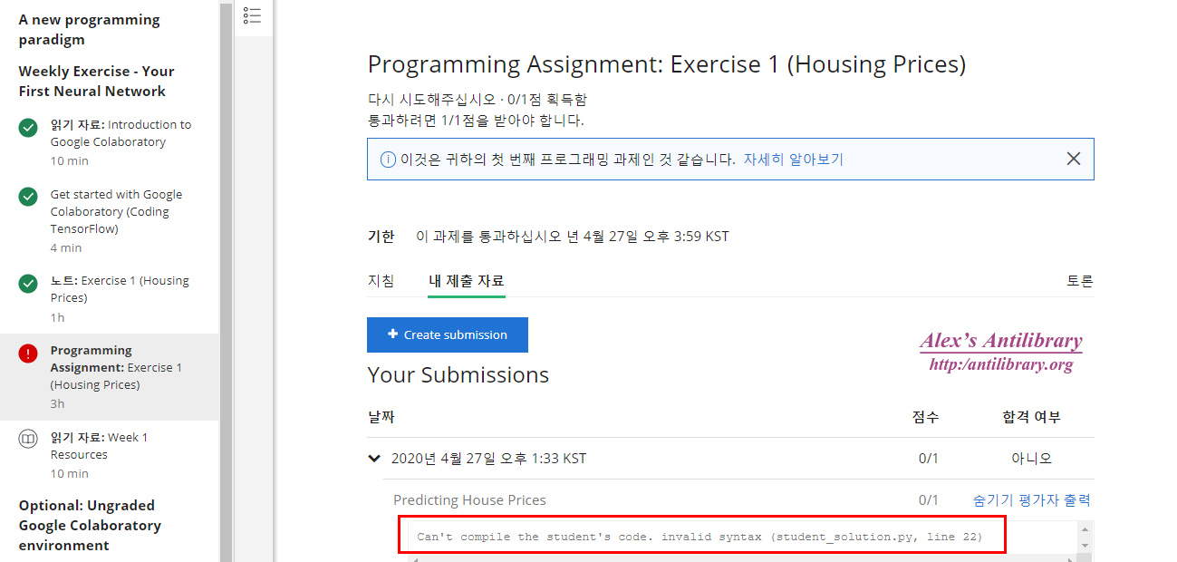 코세라 강의 Introduction to TensorFlow for Artificial Intelligence, Machine Learning, and Deep Learning 과제 제출시 다음과 같은 오류가 발생하는 경우