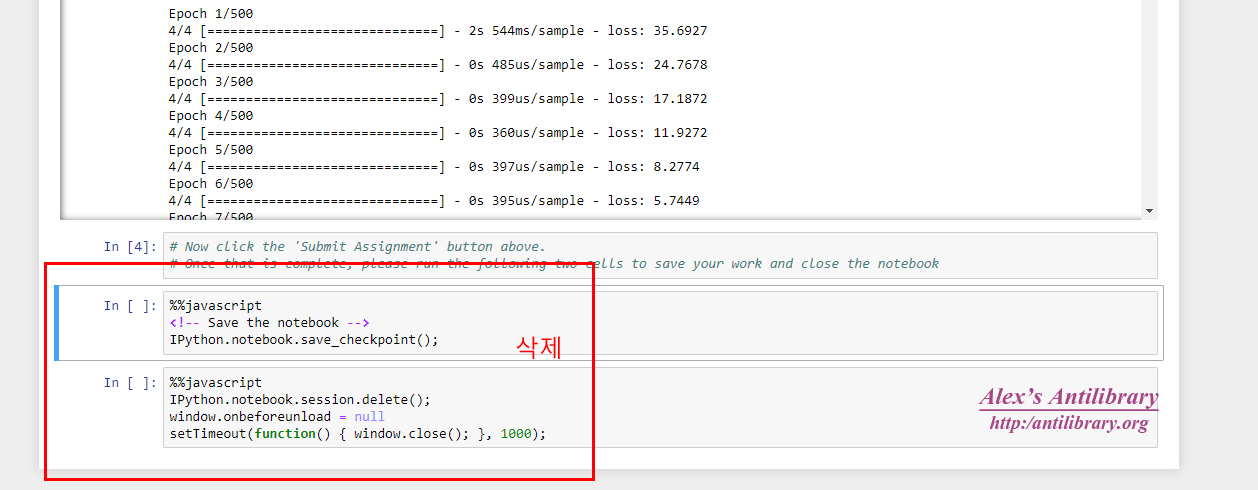 이 경우 노트북 화면에서 최하단의 자바스크립트 2개 블럭을 삭제하고 제출한다.