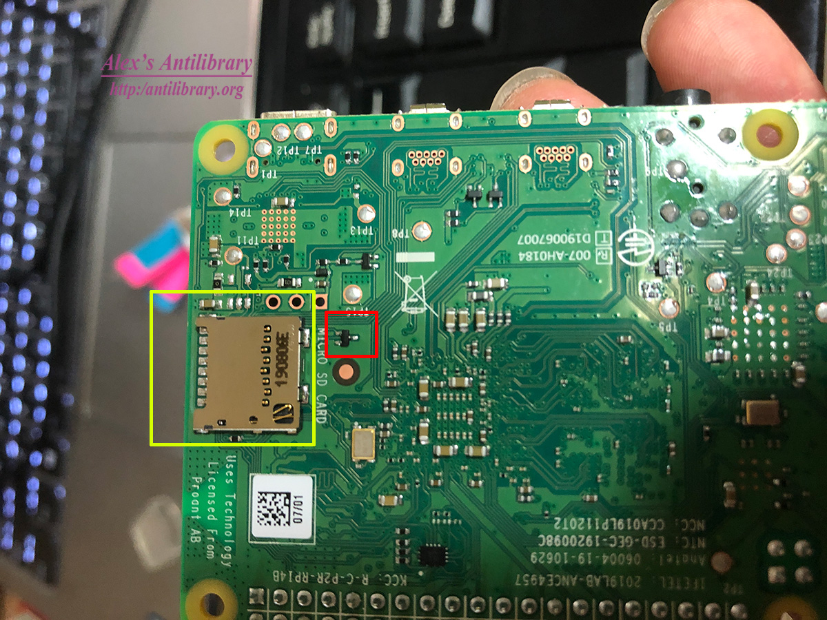 아래쪽을 보면 microSD 카드 꽂는 슬롯이 있다. 형광색으로 둘러쳐진 부분이 microSD 카드를 넣는 부분이다. 그리고 빨간 박스가 쳐진 부분은 USB-C 이슈를 해결한 Revision c03112 (1.2) 제품임을 육안으로 구별할 수 있는 방법 중 하나다.