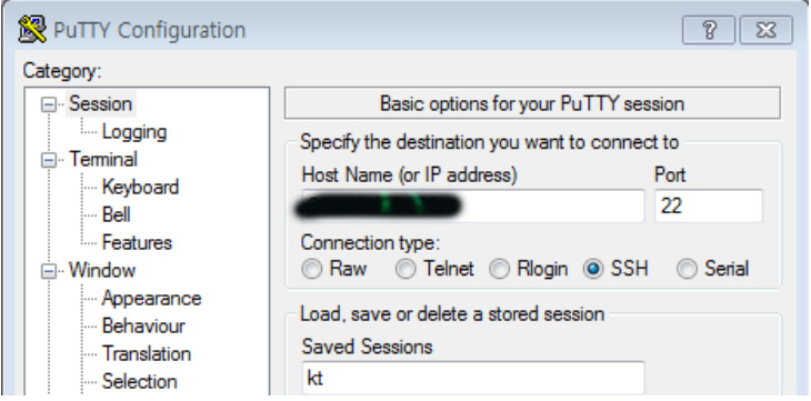 이후 외부망(다른 네트워크)에서 PuTTY 등으로 접속을 시도하는 흐름입니다. 그러면 putty 를 사용하여 다른 대역의 PC 에서 접속을 시도해보자. 호스트네임에 위의 ip 주소를 입력하고 연결한다.