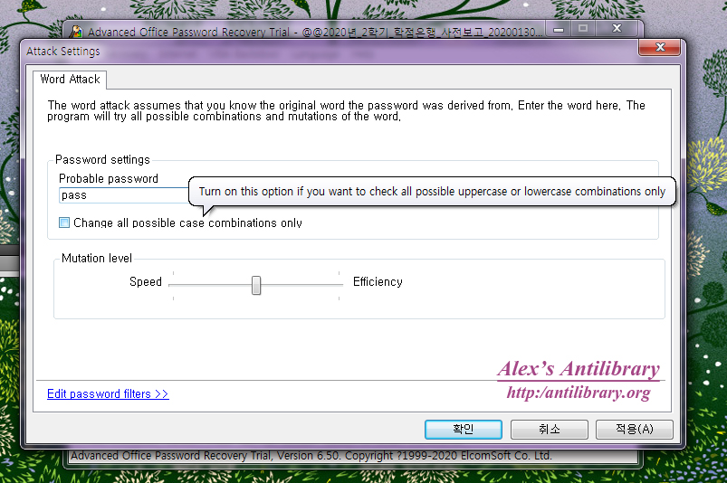 Word Attack 은 특정 단어에서 비밀번호가 파생되었다고 생각되는 경우 해당 단어를 입력하여 이를 기본으로 조합하여 찾는 방법이다. 아래와 같이 해당 단어 pass 를 입력하고 확인을 누른다.