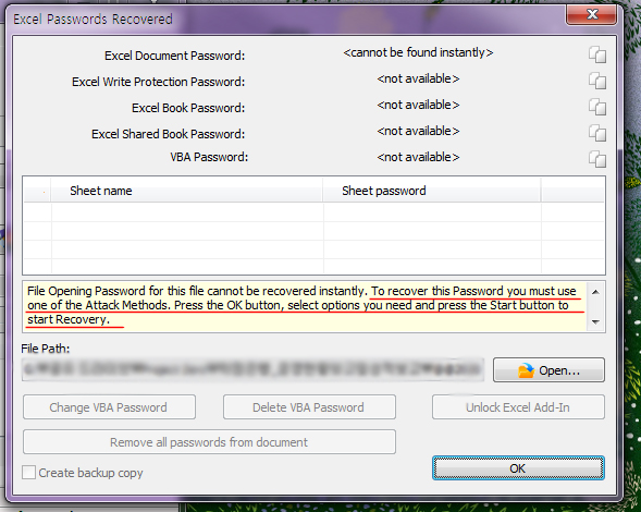 Continue 를 누르면 복구된 정보를 볼 수 있다. 비밀번호는 트라이얼 버전의 제약상 볼 수 없지만, 보여주는 항목들을 보면, 시트 이름이 정확하게 추출된 것으로 봐서 제대로 비밀번호를 찾은 것으로 볼 수 있겠다.