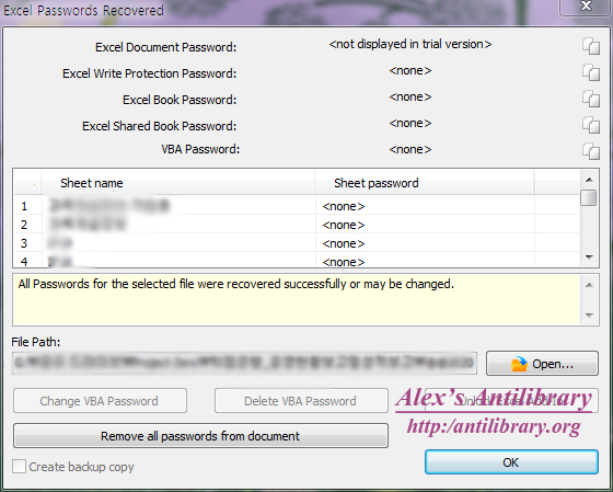 Continue 를 누르면 복구된 정보를 볼 수 있다. 비밀번호는 트라이얼 버전의 제약상 볼 수 없지만, 보여주는 항목들을 보면, 시트 이름이 정확하게 추출된 것으로 봐서 제대로 비밀번호를 찾은 것으로 볼 수 있겠다.