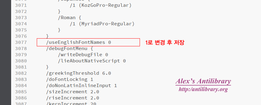 해당 폴더내에 있는 AIPrefs 파일을 메모장 등으로 연 다음 다음과 같이 /useEnglishFontNames 값을 찾아서 기존의 0 에서 1 로 수정한 후 저장한 다음, 다시 실행하면 된다.