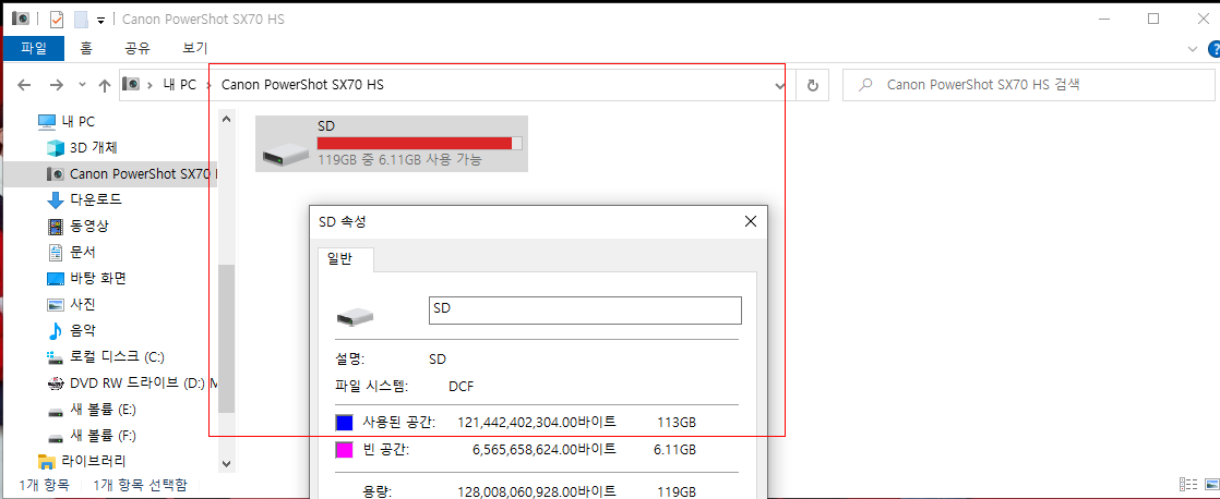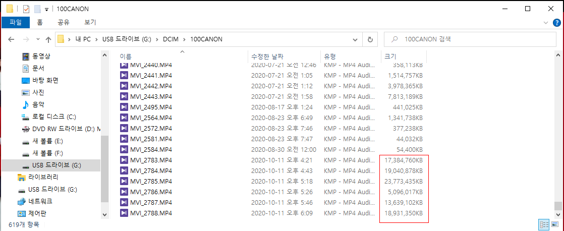 촬영을 끝낸 후 파일을 SD카드에서 PC로 옮길려고 하였는데 - 여기서 옮긴 방식은 카메라와 PC 를 케이블로 연결한 방식이다. 카드 리더기가 하필 이때 보이지 않아 찾다가 케이블로 복사를 하려고 하였다 - 이렇게 연결하고 탐색기 상에서 해당 파일을 살펴보니 파일이 전부 0byte 로 나온다.