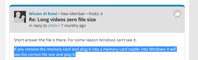Franknyc • New Member • Posts: 1 Re: Long videos zero file size chillo wrote: Wisam Al Rawi wrote: Short answer the file is there. For some reason Windows can't see it.\ Same. Update here: I checked the camera and the file is on the memory card intact.