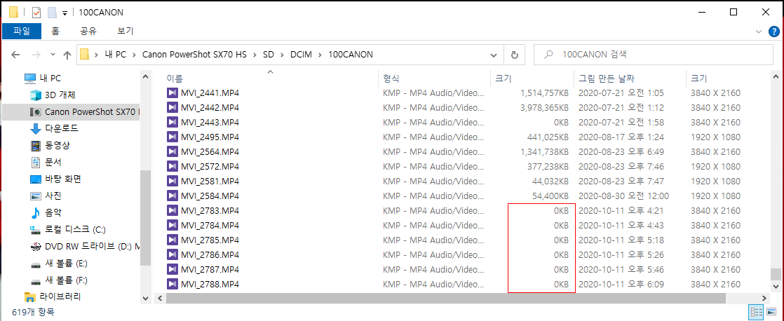 촬영을 끝낸 후 파일을 SD카드에서 PC로 옮길려고 하였는데 - 여기서 옮긴 방식은 카메라와 PC 를 케이블로 연결한 방식이다. 카드 리더기가 하필 이때 보이지 않아 찾다가 케이블로 복사를 하려고 하였다 - 이렇게 연결하고 탐색기 상에서 해당 파일을 살펴보니 파일이 전부 0byte 로 나온다.