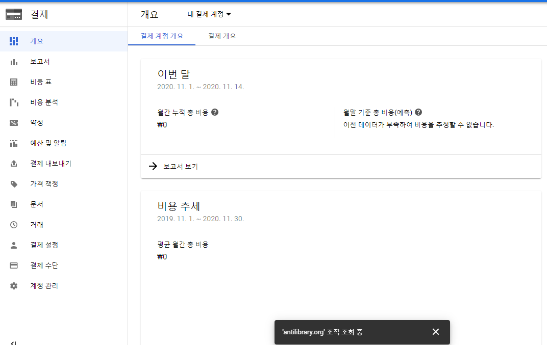 결제 개요 페이지로 돌아와보면 이번 달 금액이 0 원으로 되어 있음을 확인할 수 있다.