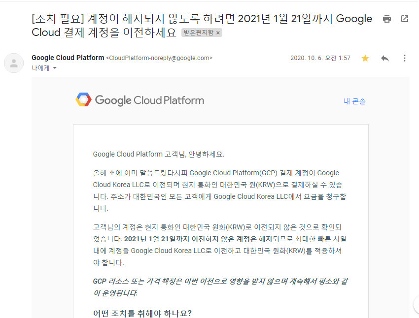 다음과 같은 메일을 지난 달 받았다. 몇 년째 구글 클라우드 플랫폼을 사용을 하고 있는데, GCP 결제계정이 Google Cloud Korea LLC 로 이전되어 이제 주소가 대한민국인 모든 고객에게 Google Cloud Korea LLC 에서 요금을 청구하게 되어, 계정을 2021년 1월 21일까지 이전해야 한다고 한다.