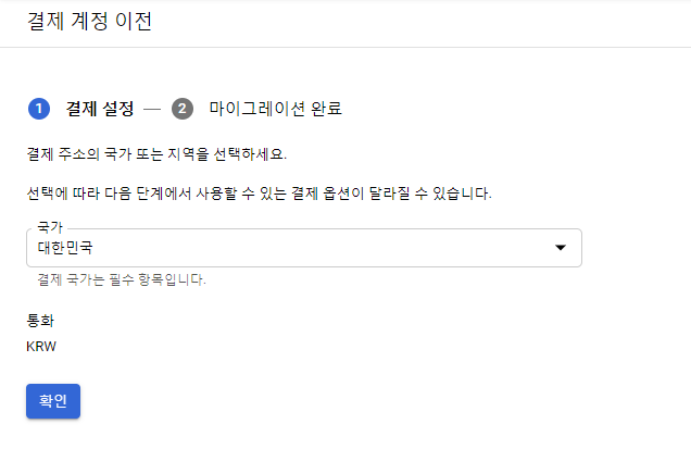 이어서 이전 작업을 계속 진행해보자. 국가를 대한민국으로 선택하고 확인을 누른다.