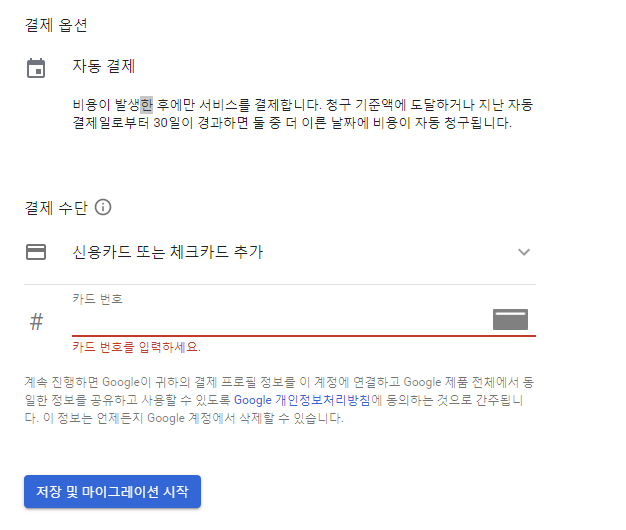 카드 정보를 입력하고 저장 및 마이그레이션 시작을 누른다.