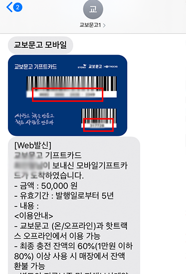 일련번호가 기재된 5만원권 기프트카드를 확인할 수 있다.