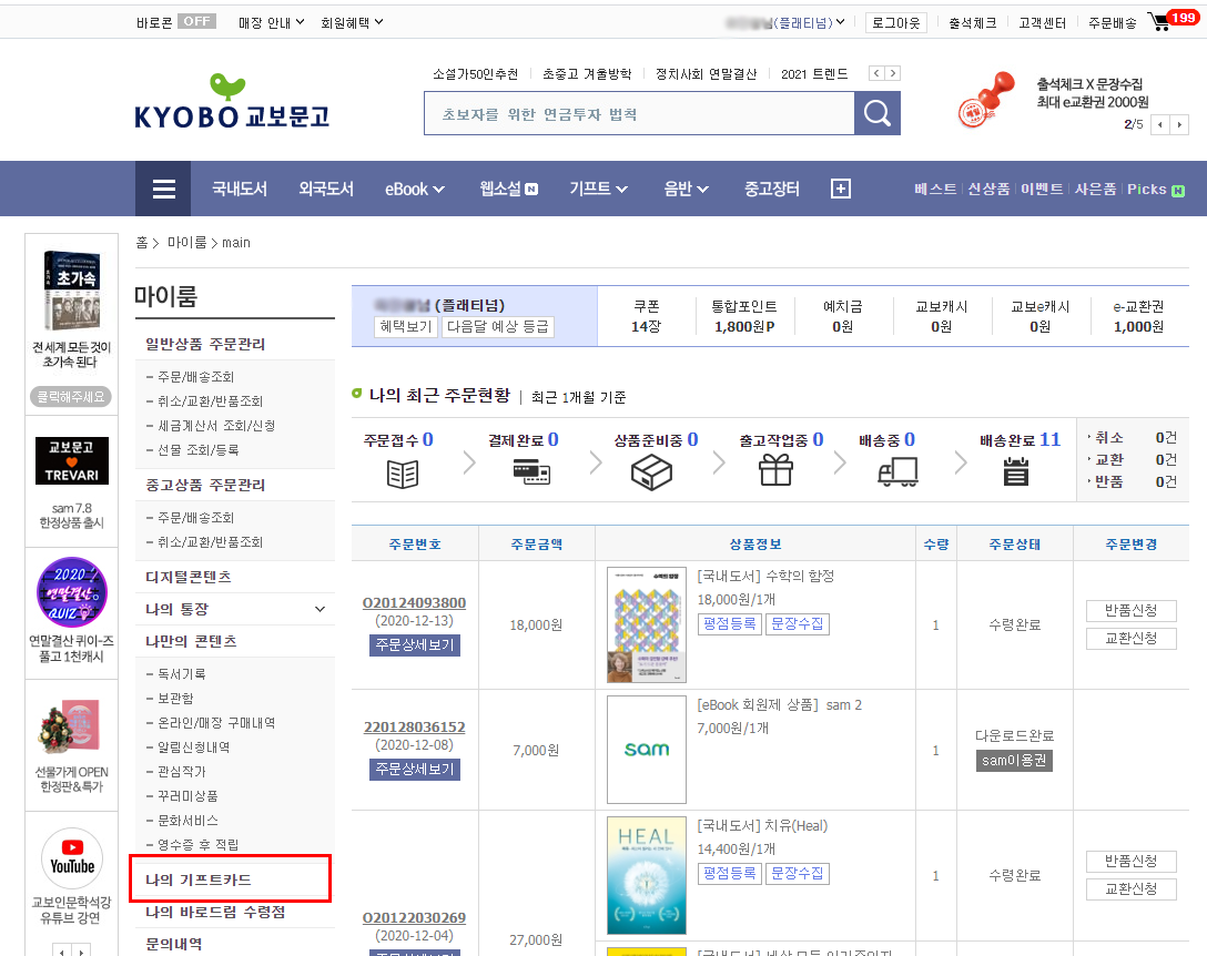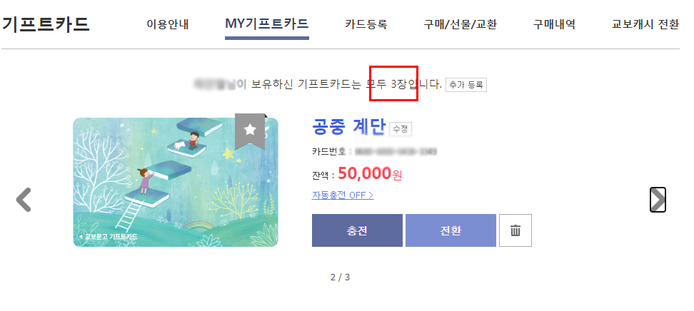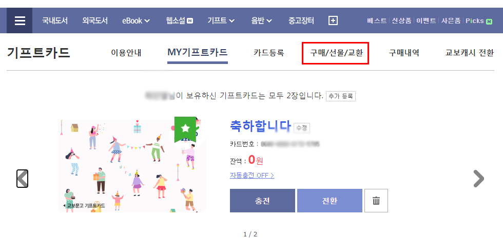 이제 교보문고 홈페이지 로그인 후 [나의 기프트카드]로 이동한다.