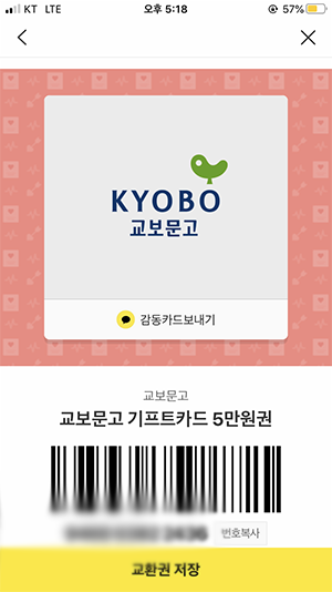 카카오톡 선물하기를 통해 받은 교보문고 기프트 쿠폰은 바로 사용이 불가능하다. 먼저 교보문고 기프트카드로 교환 후 상품구매시 이용이 가능하다. 아래에서 교환 후 사용방법에 대해 알아보자.