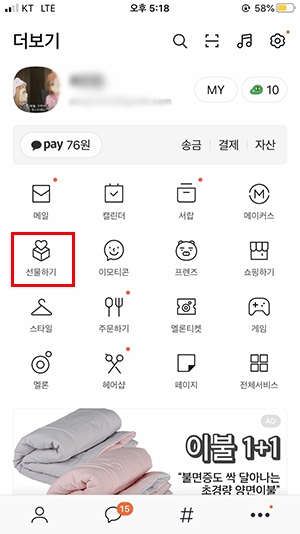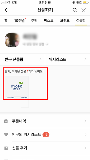 선물함으로 이동하면 받은 선물함에 미사용 선물이 하나 있음을 확인할 수 있다.