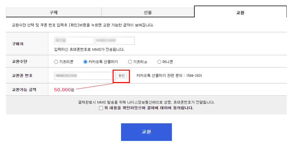 교환 탭 선택 후 카카오톡으로 받은 쿠폰번호 입력
